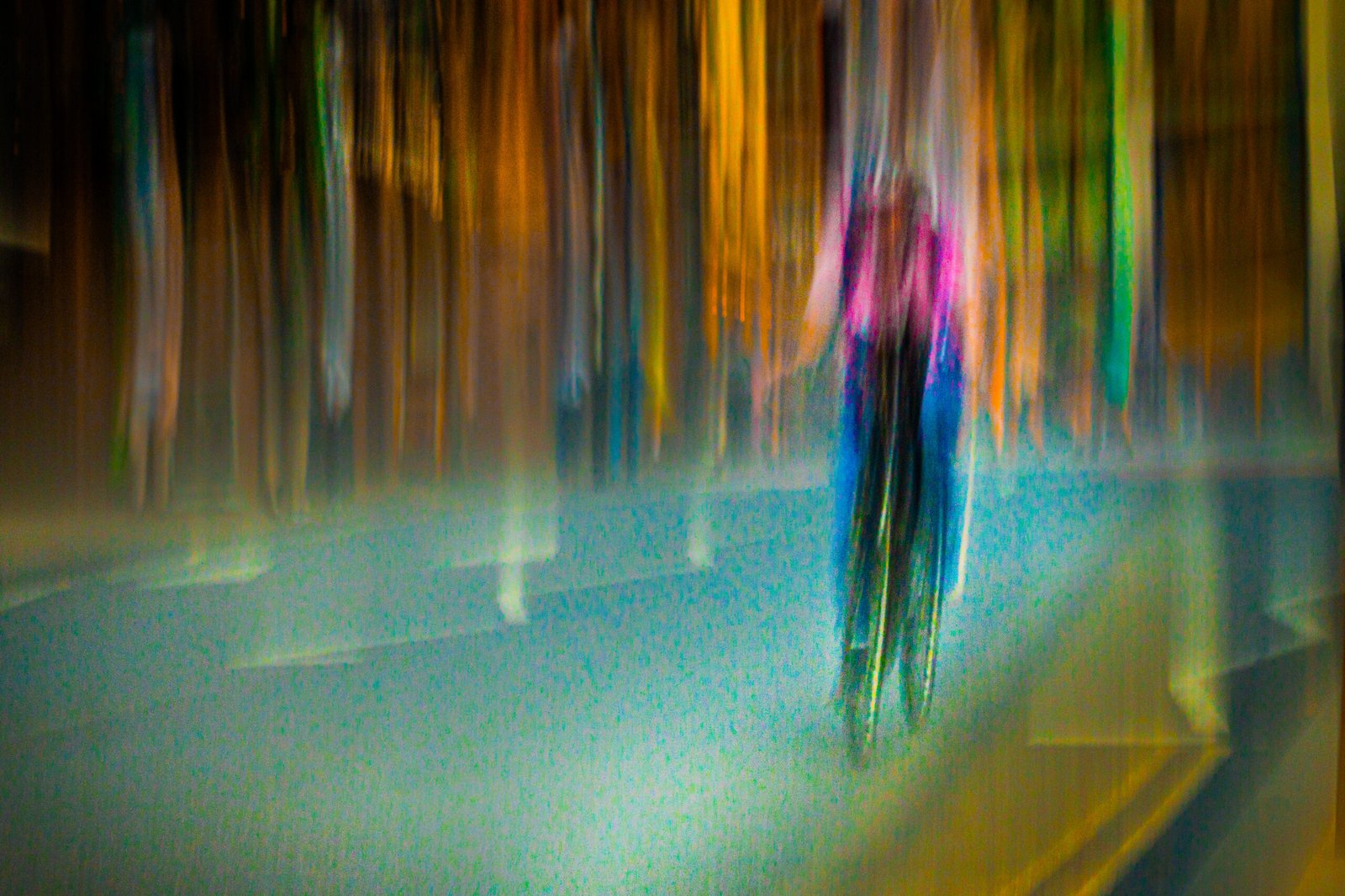 Bright city colours just whizz by as the cyclist rides through.